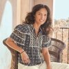 Texture defines this flowing top—tonal embroidery on a cotton dobby fabric and novelty yoke rich in eyelet details. Center placket with three covered buttons. raw edge ruffles at the neckline. Cotton. Machine wash. Imported. Exclusive. Sizes XS (0–2). S (4–6). M (8–10). L (12–14). XL (16–18). XXL (20–22). Approx. 23l.