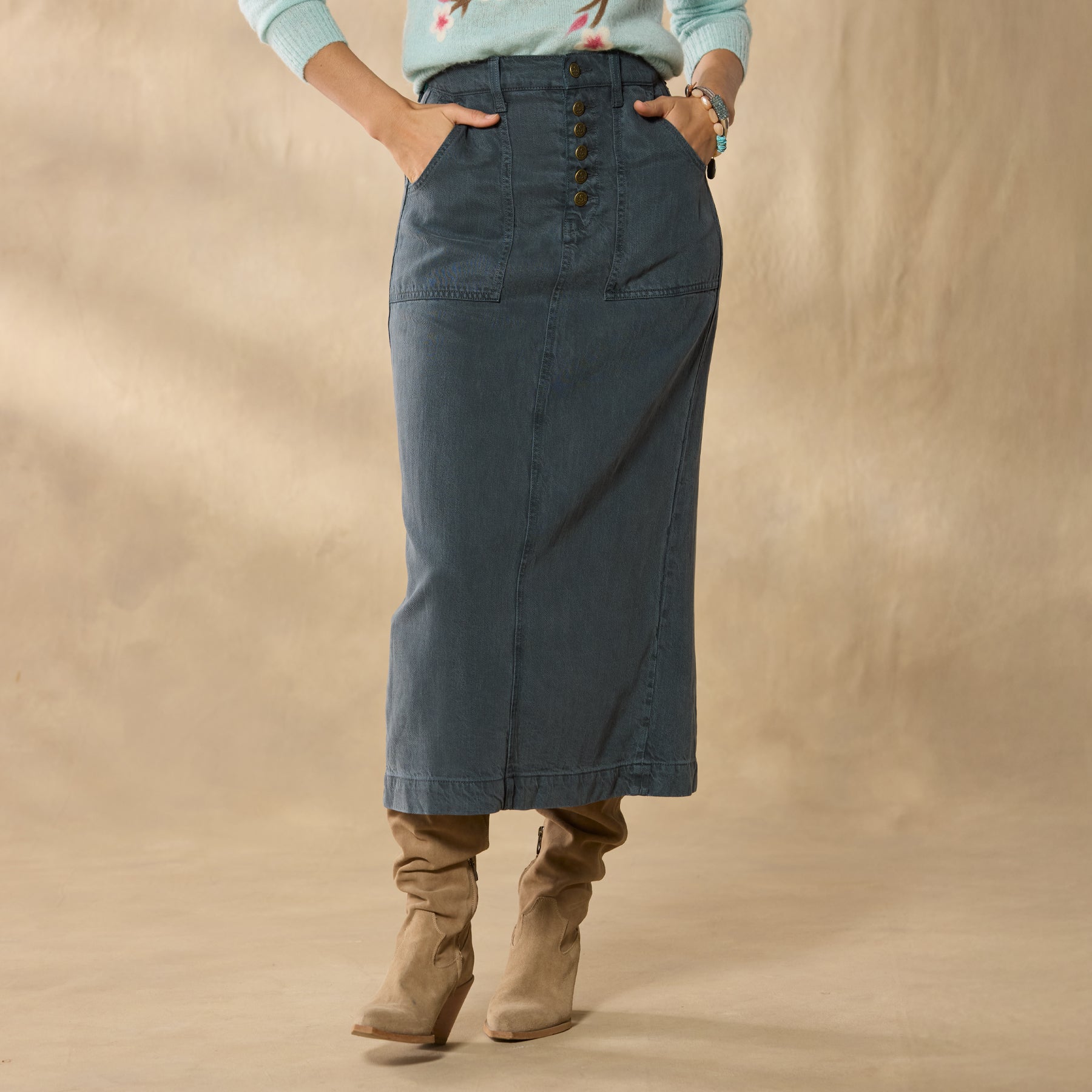 An instant everyday staple. our Bosque Skirt features an ultra-wearable midi length with a button fly. front patch pockets and a back slit. Tencel/linen/cotton. Machine wash. Imported. Exclusive. Sizes 24?C32. Approx. 30l.