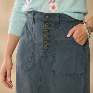 An instant everyday staple. our Bosque Skirt features an ultra-wearable midi length with a button fly. front patch pockets and a back slit. Tencel/linen/cotton. Machine wash. Imported. Exclusive. Sizes 24?C32. Approx. 32.5l.