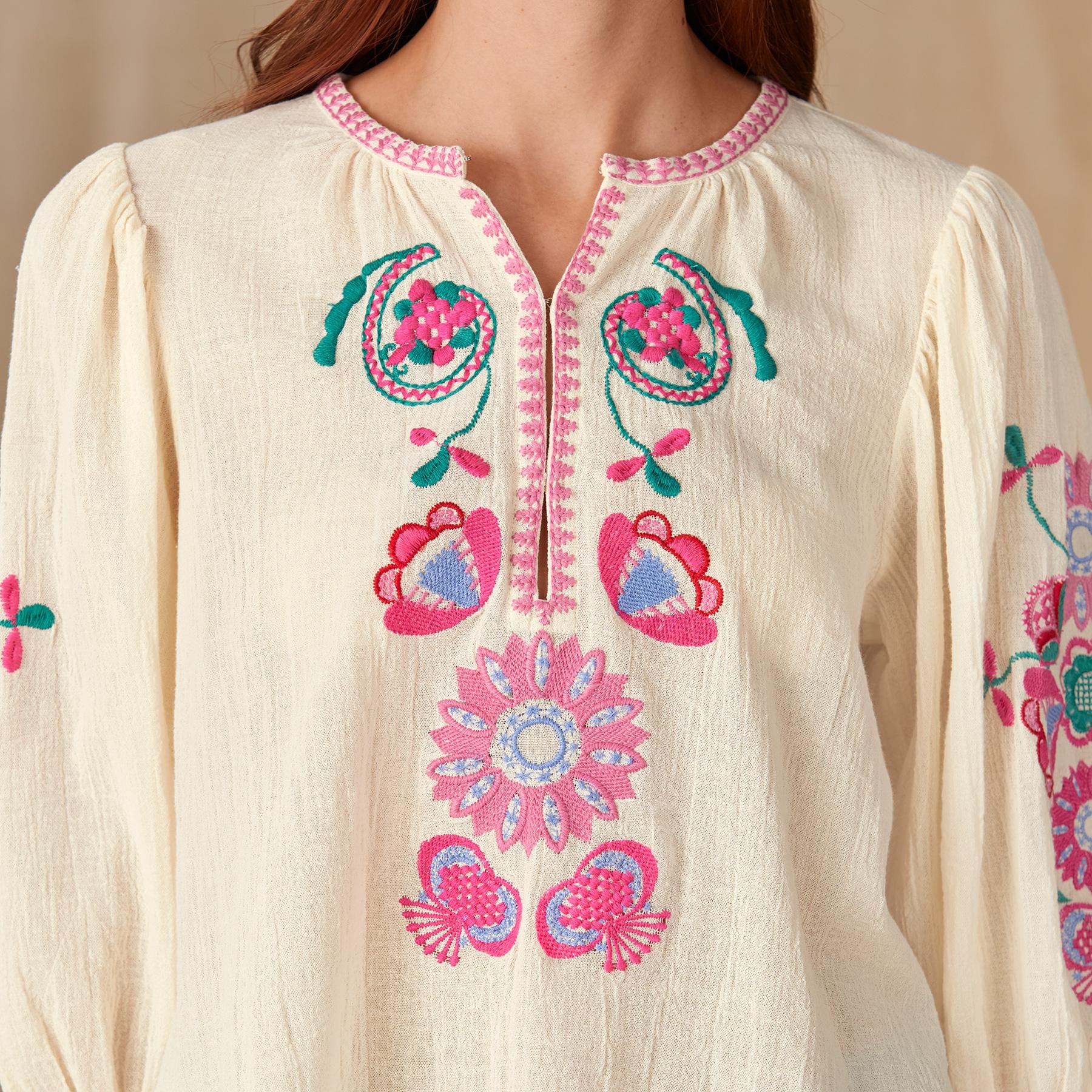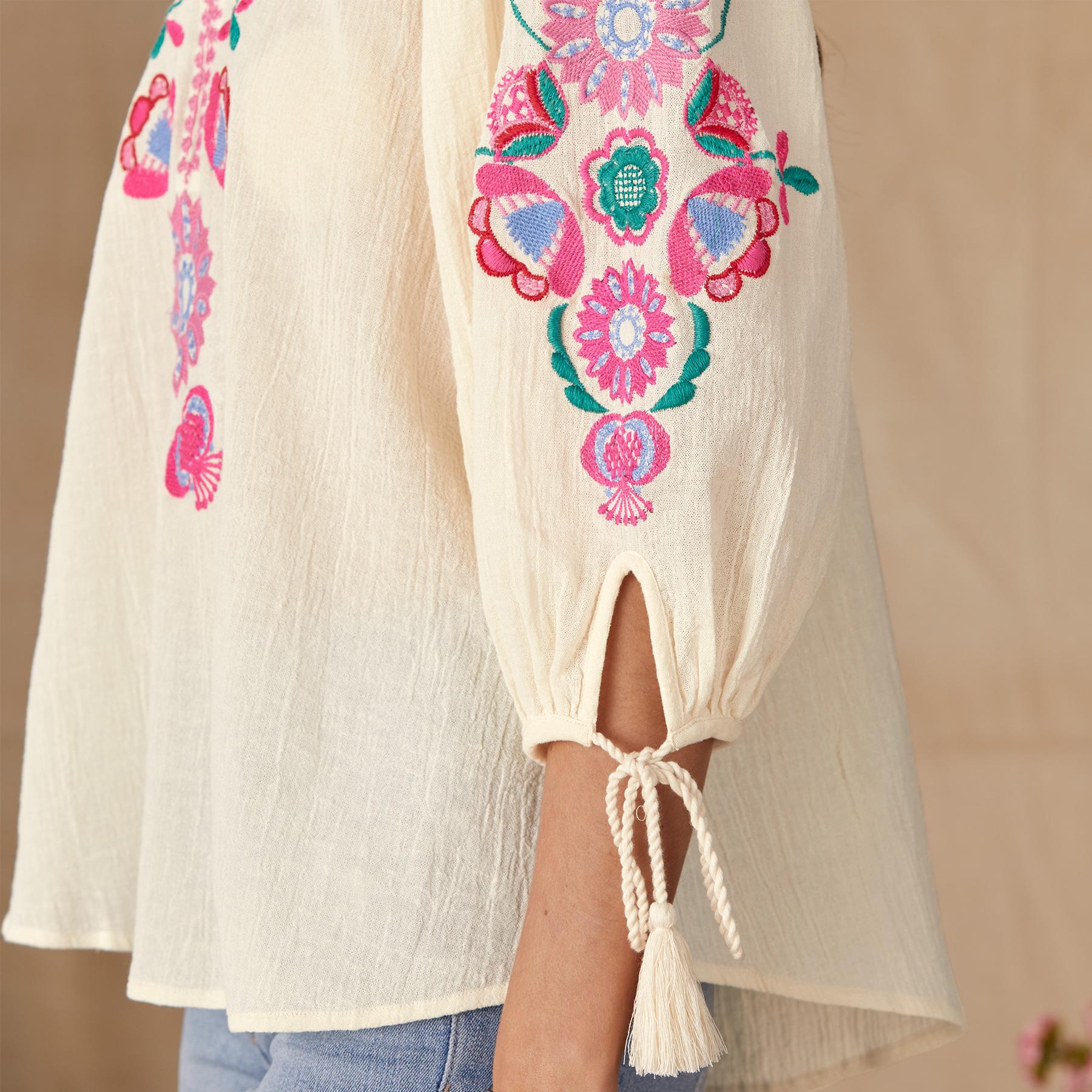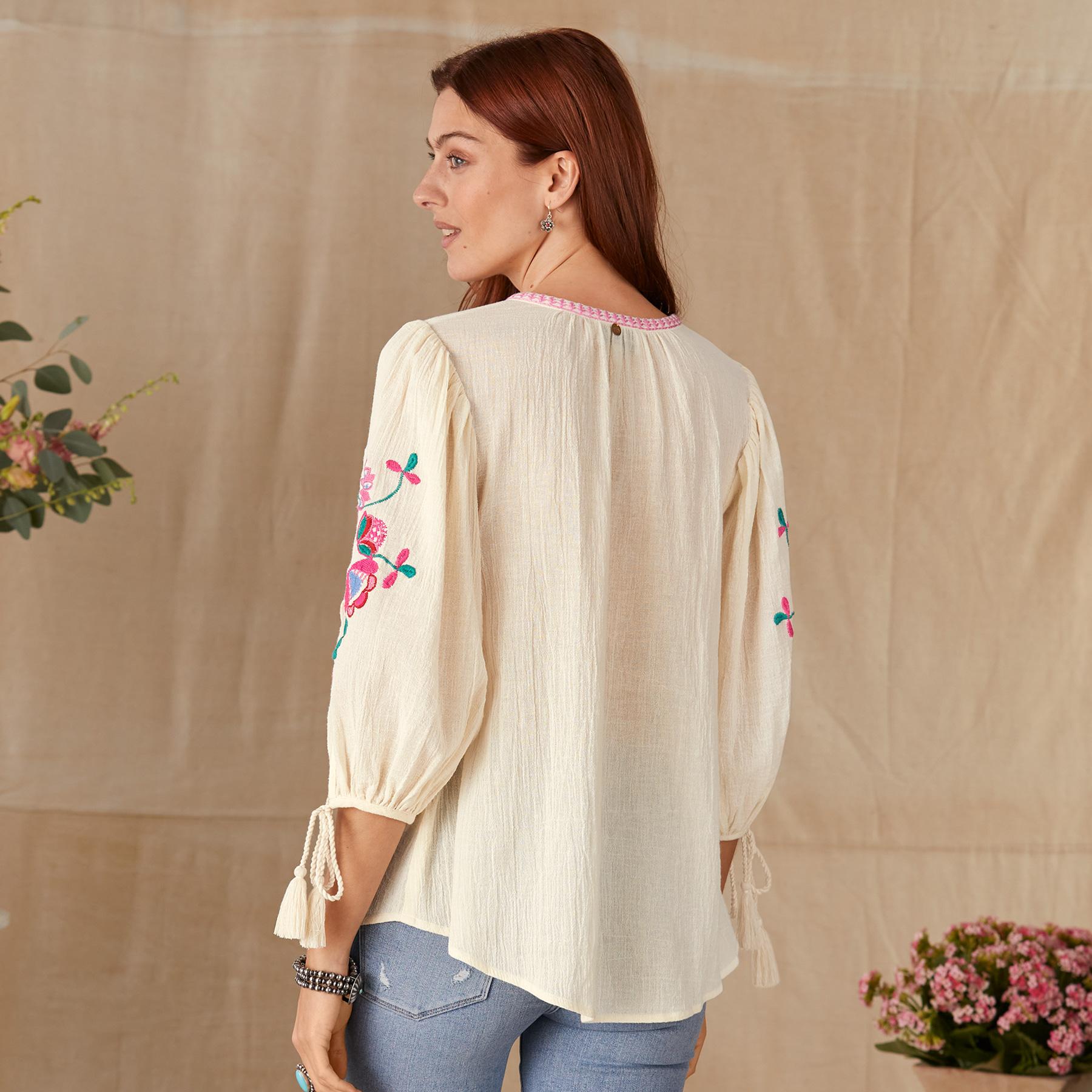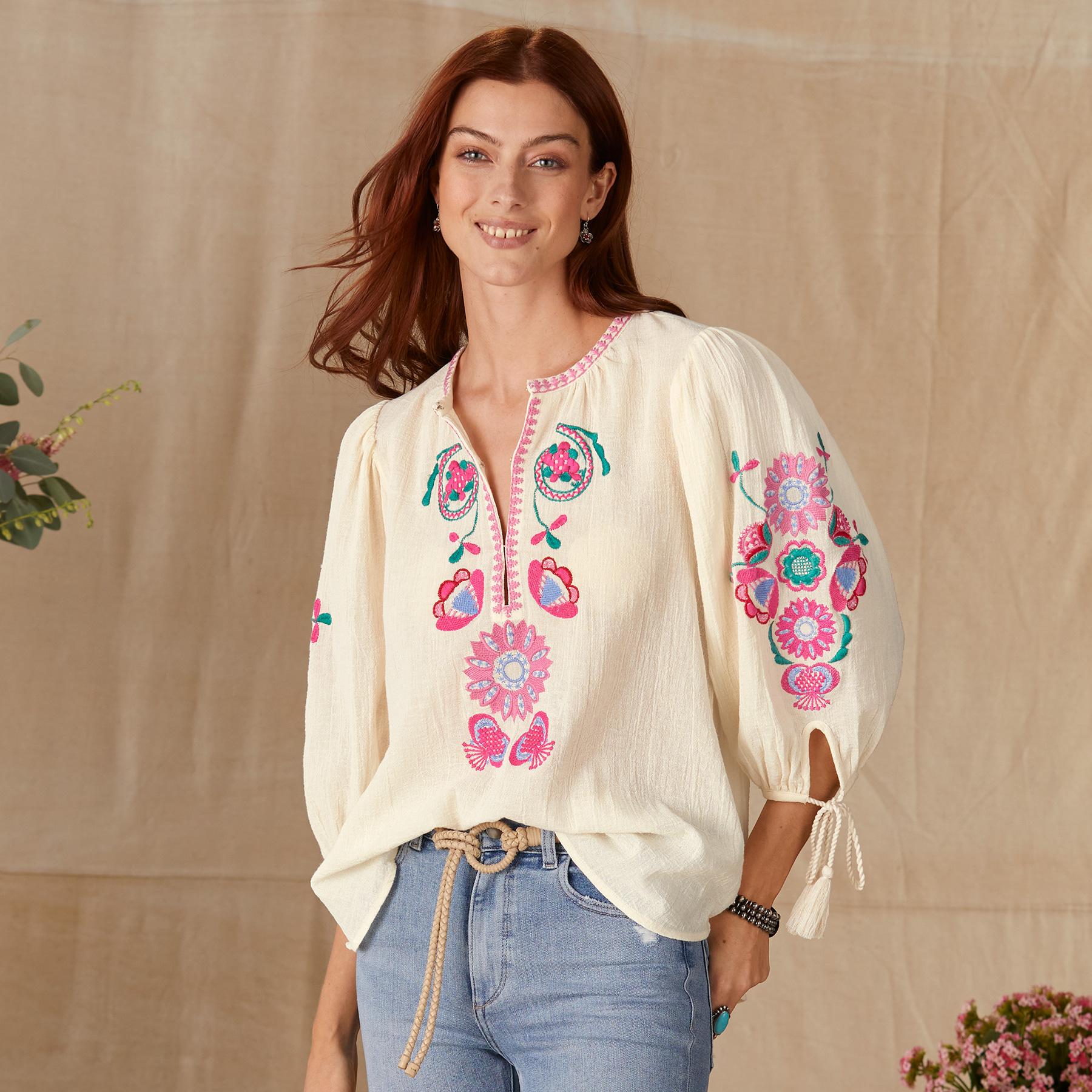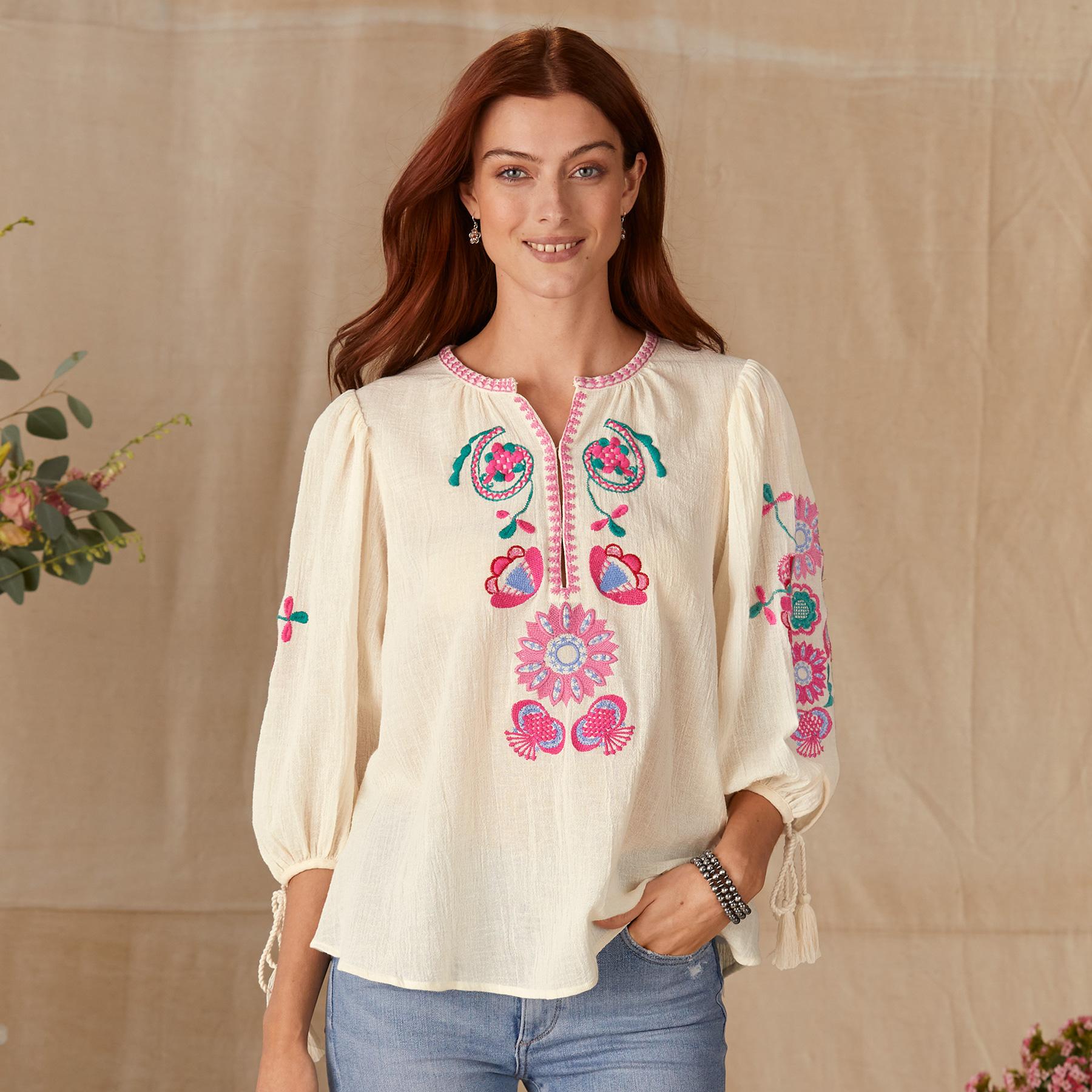 Bright batik floral embroidery and a delicate embroidered neckline make this blouse one you will reach for again and again. Cotton. Hand wash. Imported. XS (36). S (38). M (40). L (42). Approx. 26L.