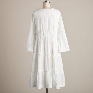 This tiered. mini-ruffle dress is a vision in white with dainty. allover eyelet details; bell sleeves. and deep V-neckline. Lined at skirt. Cotton. Machine wash. Imported. Exclusive. Sizes XS (0 to 2). S (4 to 6). M (8 to 10). L (12 to 14). XL (16 to 18). Approx. 41L.