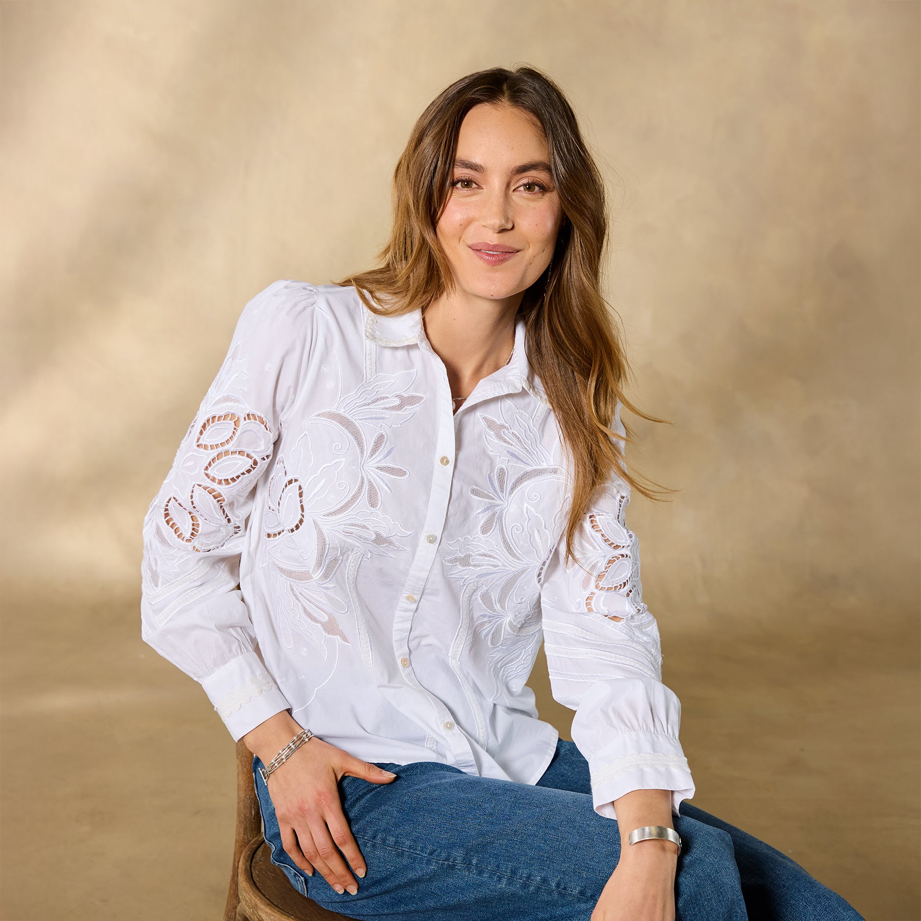 Tonal embroidery lends understated elegance to our textured button-down top with novelty trim detail. ladder lace and shirring at the back yoke. Cotton. Hand wash. Imported. Exclusive. Sizes XS (0–2). S (4–6). M (8–10). L (12–14). XL (16–18). XXL (20–22). Approx. 25.5l.