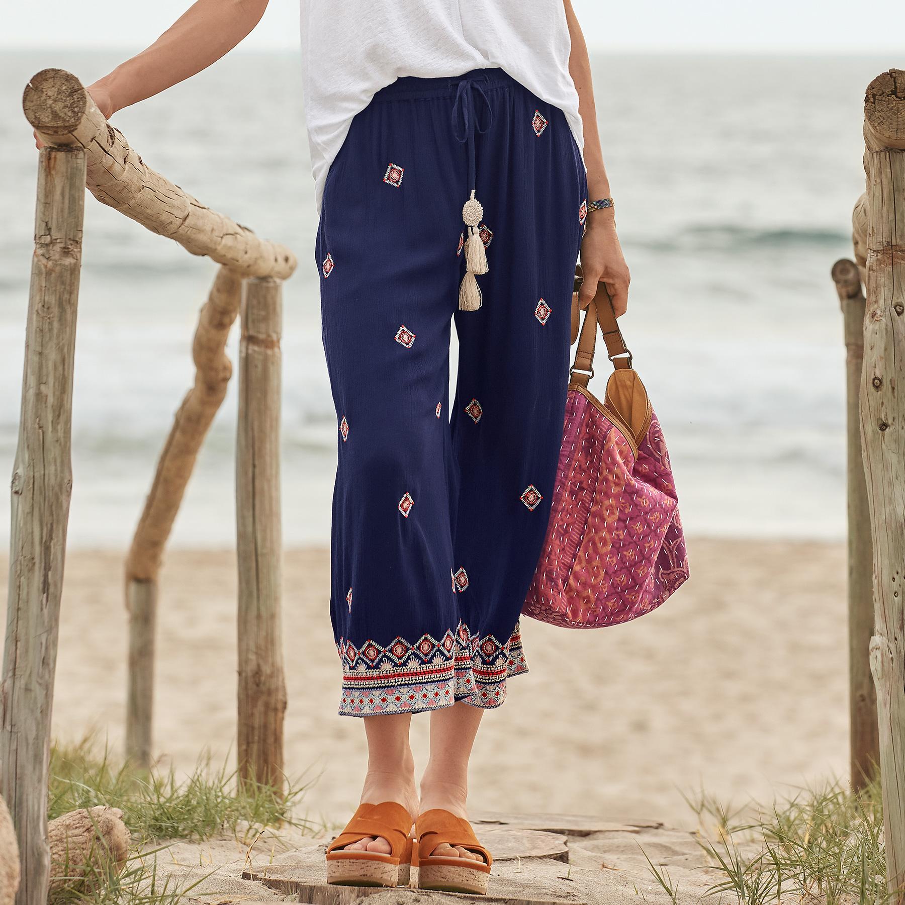Our Niovi Pants are fashioned from the most delightful crinkle rayon crepe for the easiest. breeziest lightweight feel. In a cropped. wide-leg silhouette. with colorful allover embroidery and crochet tassel detail on elastic waistband tie. Great travel pants! Hand wash. Imported. Exclusive. Sizes XS (0–2). S (4–6). M (8–10). L (12–14). XL (16–18). XXL (20–22). 23 inseam.