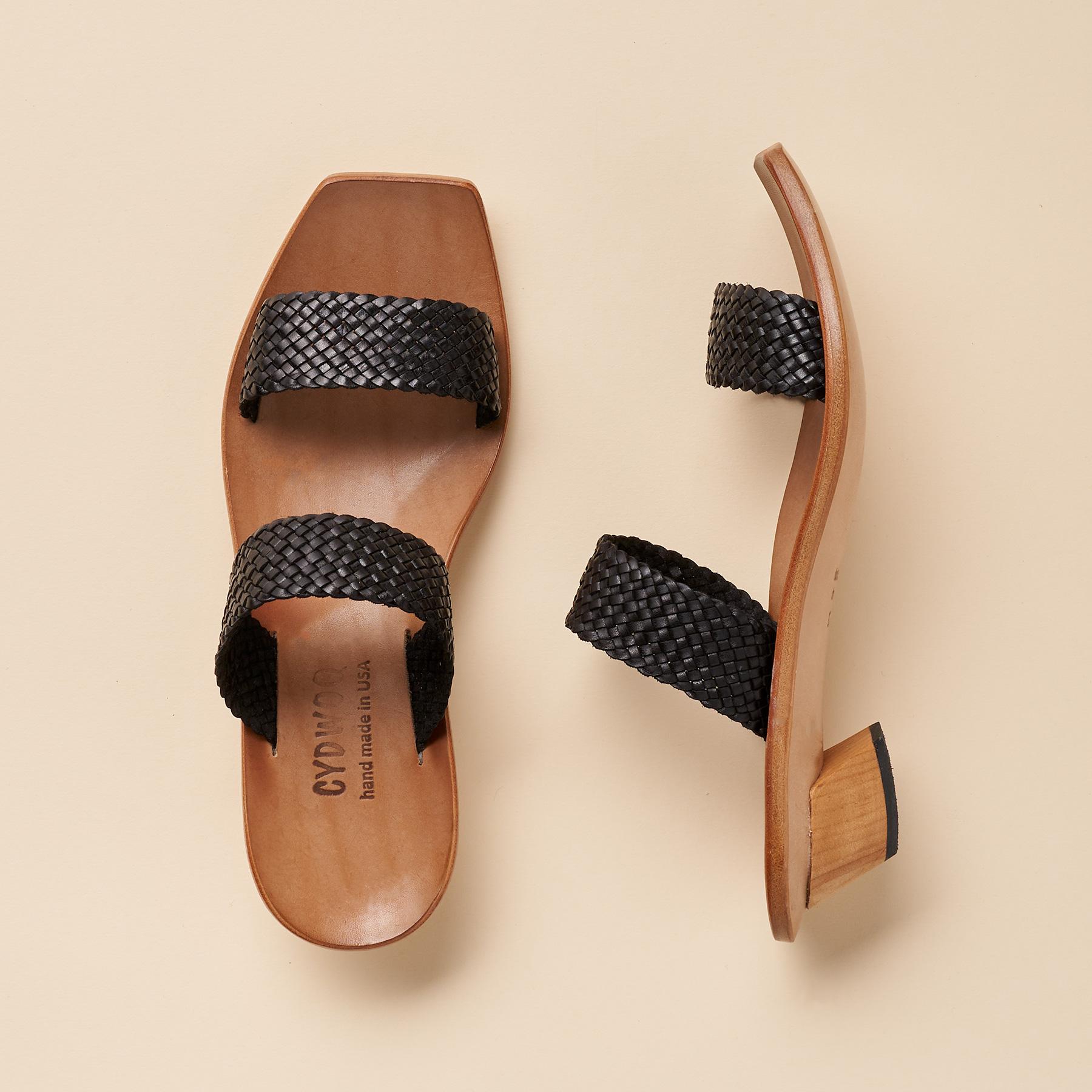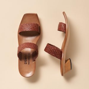 Textured woven leather slip-on sandals with a molded wood footbed and a kitten heel strike a perfect balance between ease and style. Leather. Sizes 36 to 42. 36 (US 6). 37 (US 7). 38 (US 8). 39 (US 9). 40 (US 10). 41 (US 11). 42 (US 12). 1 heel.