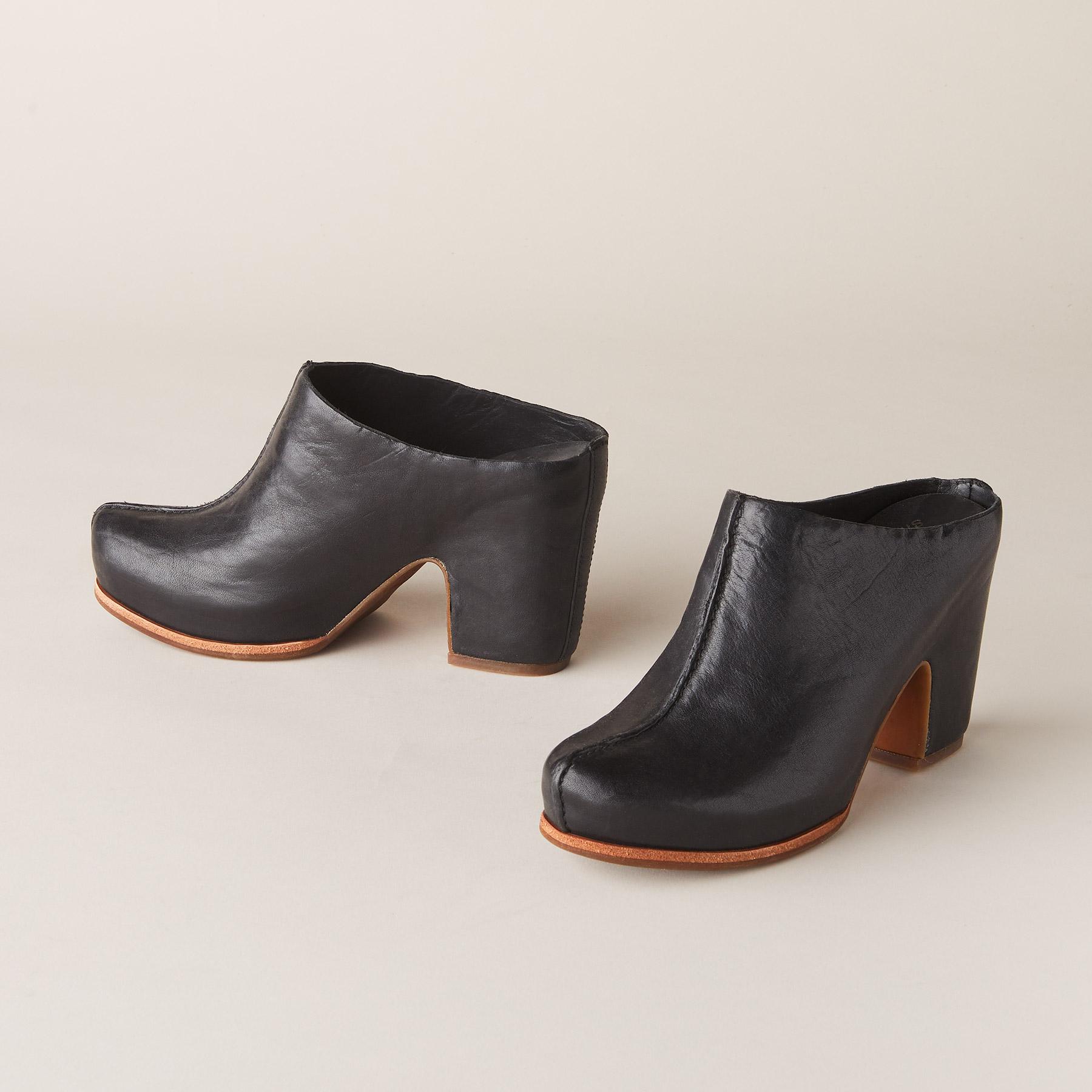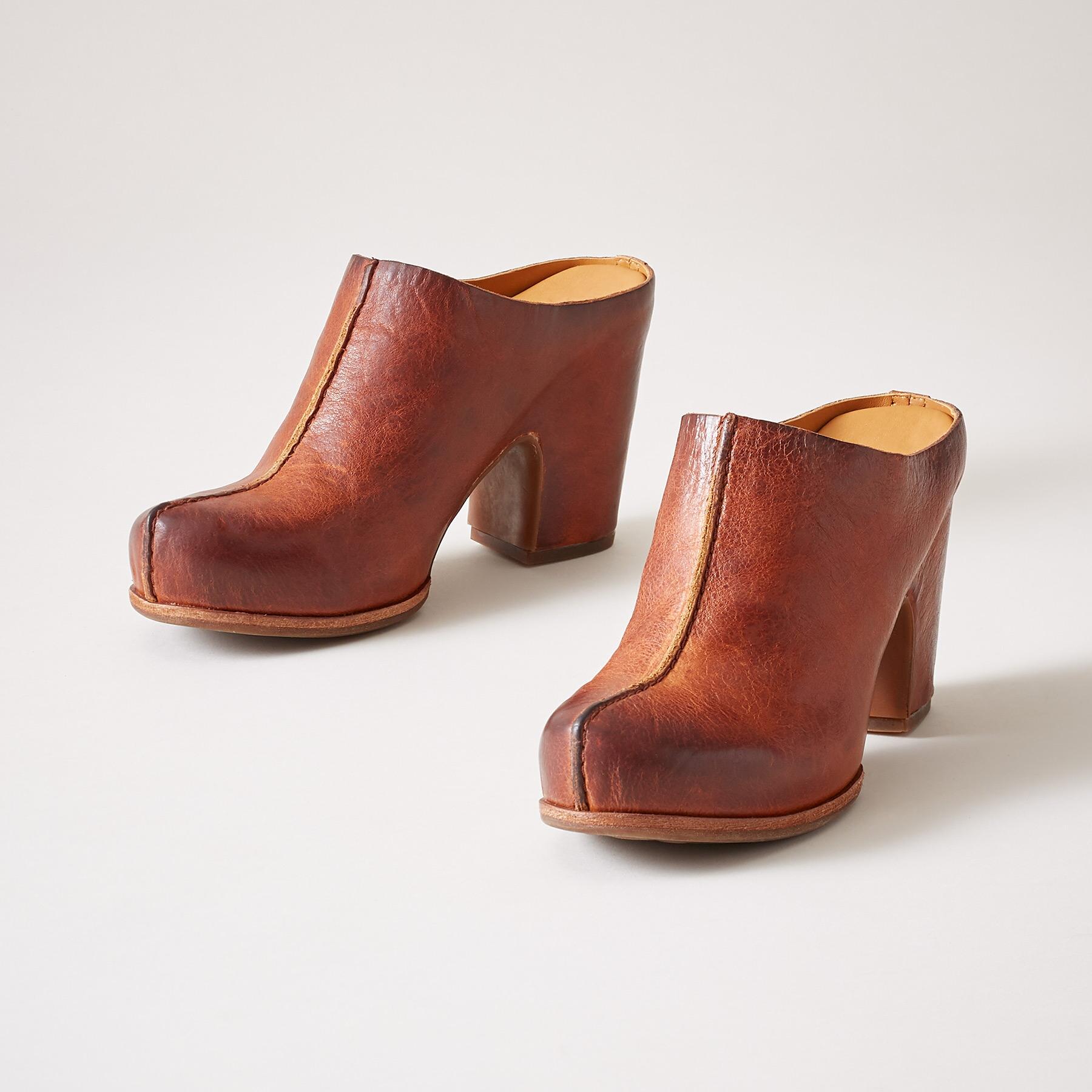 Elevated and artful. the Sagano Mules blend sculptural style with everyday sophistication. Crafted in rich leather. these bold slip-ons feature a hand-shaped wooden sole. a distinctive cutout heel. and minimalist stitching that highlights their refined silhouette. A modern statement with timeless soul.