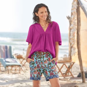 An update to a Sundance favorite. these mixed print shorts are inspired by Japanese gardens and woodcut designs in complementary patterns with florals blooming in vibrant colors. Engraved coconut button closure and zip fly. Four patch pockets. Linen/cotton. Machine wash. Imported. Exclusive. Sizes 0-14. 5 inseam.